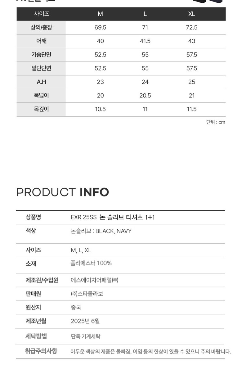 [EXR] 25SS 남성 논 슬리브 티셔츠 1+1_NEW