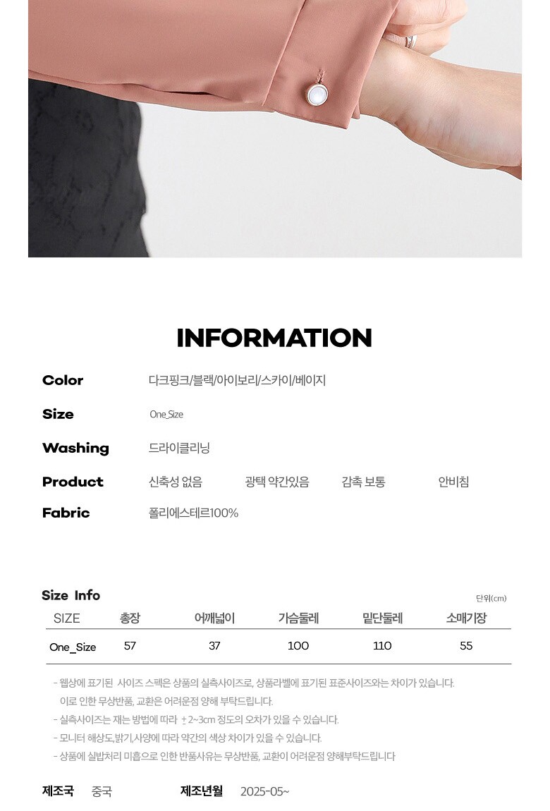• 처음 배송된 상품상태와 다를 경우(세탁/착용 후 외출하신 경우) 반품이 불가합니다.