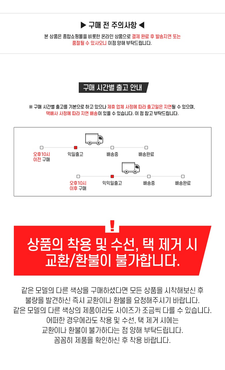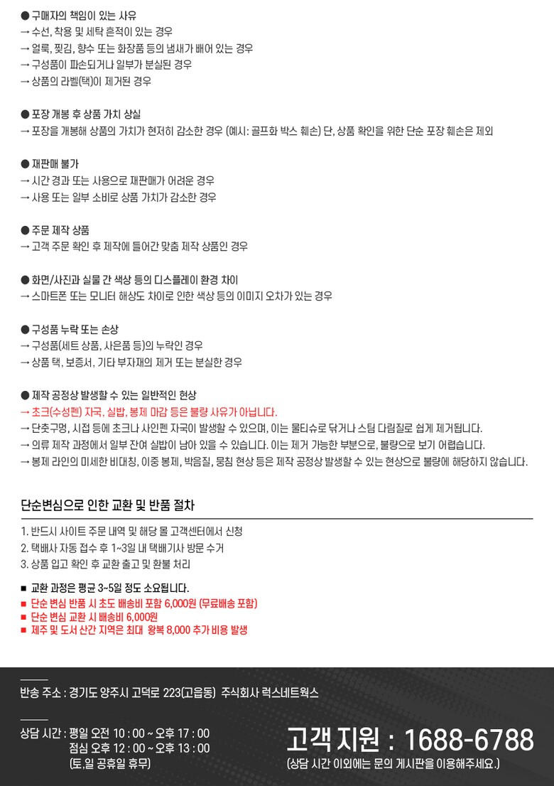 상품불량에 의한 반품, A/S, 품질보증 및 피해보상 등에 관한 사항은 소비자 분쟁해결기준(공정거래위원회 고시) 구매자가 미성년자인 경우에는 상품 구입시 법정대리인이 동의하지 아니하면 미성년자 본인 또는 법정대리인이 구매취소 할 수 있습니다. |