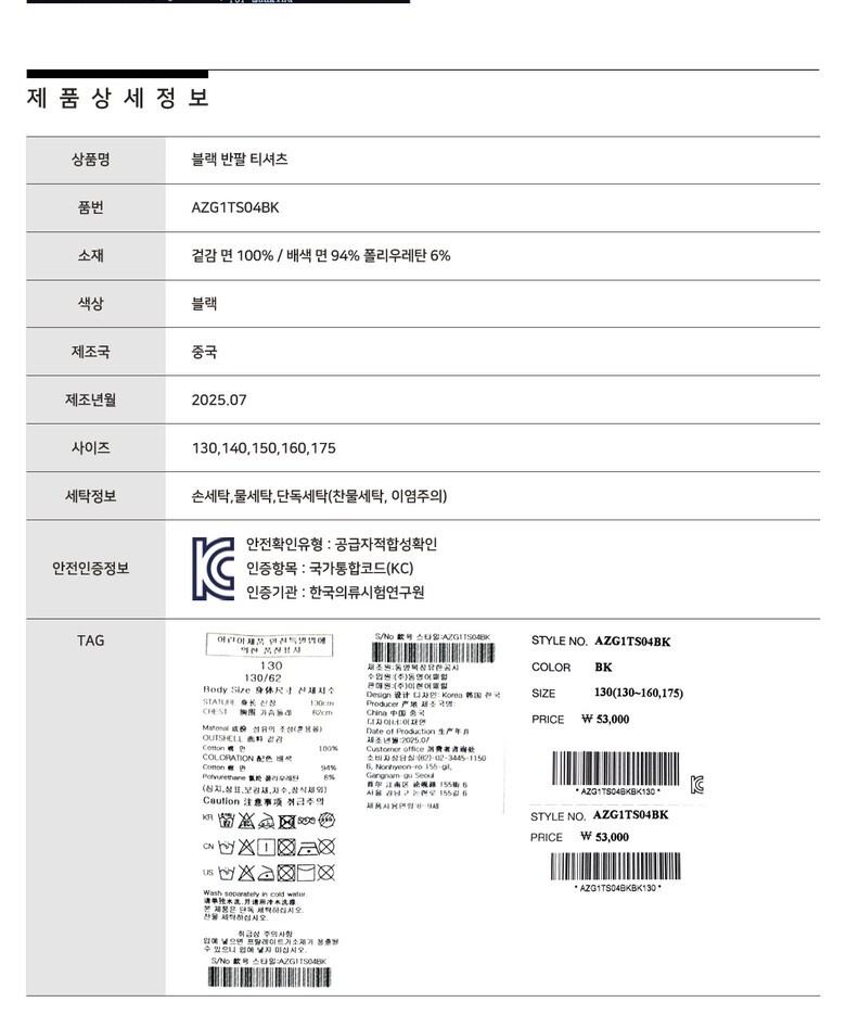 품명 및 모델명 : [블루테일]블랙 반팔 티셔츠(AZG1TS04BK)