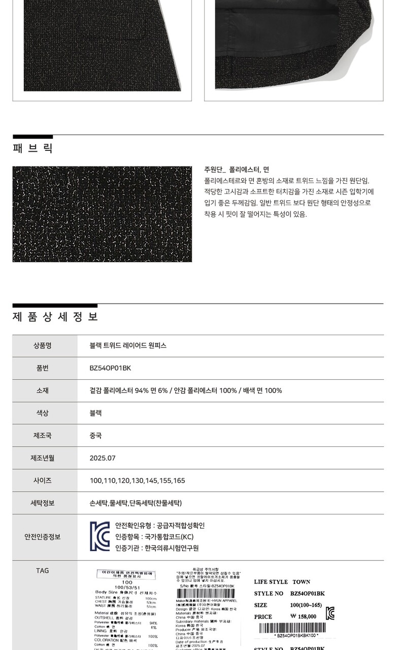 품명 및 모델명 : 블랙 트위드 레이어드 원피스(BZ54OP01BK)