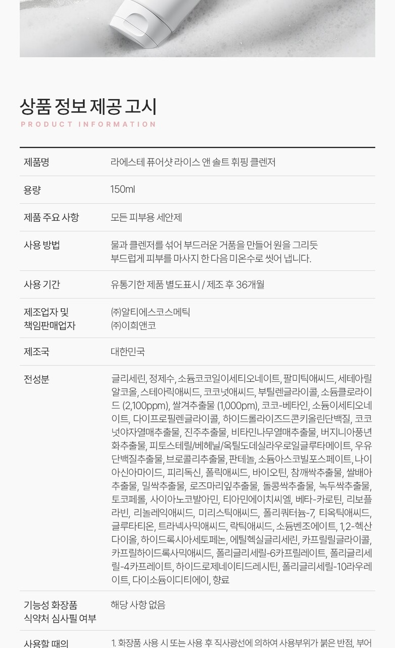 라에스테 셀퓨어샷 라이스 앤 솔트 휘핑 클렌저 150ml
