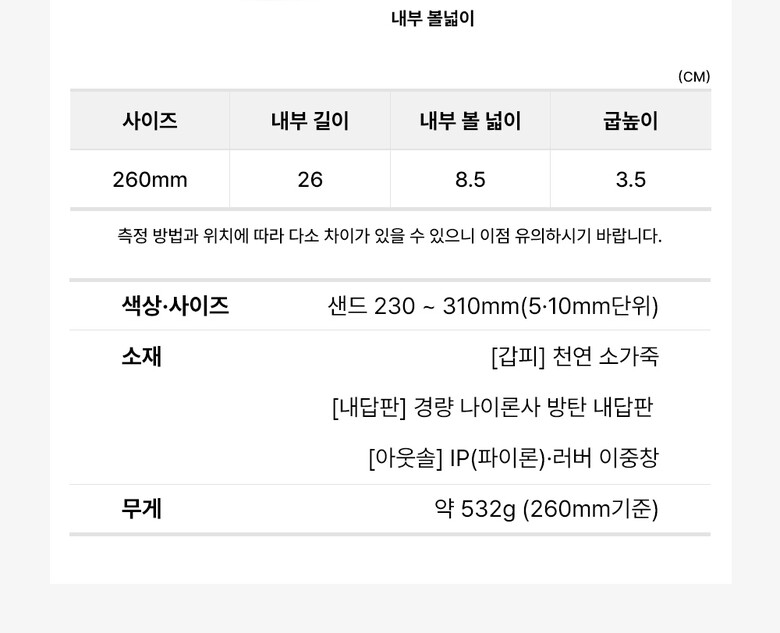 1. 제품 소재 (운동화인 경우에는 겉감, 안감을 구분하여 표시) 갑피 천연소가죽