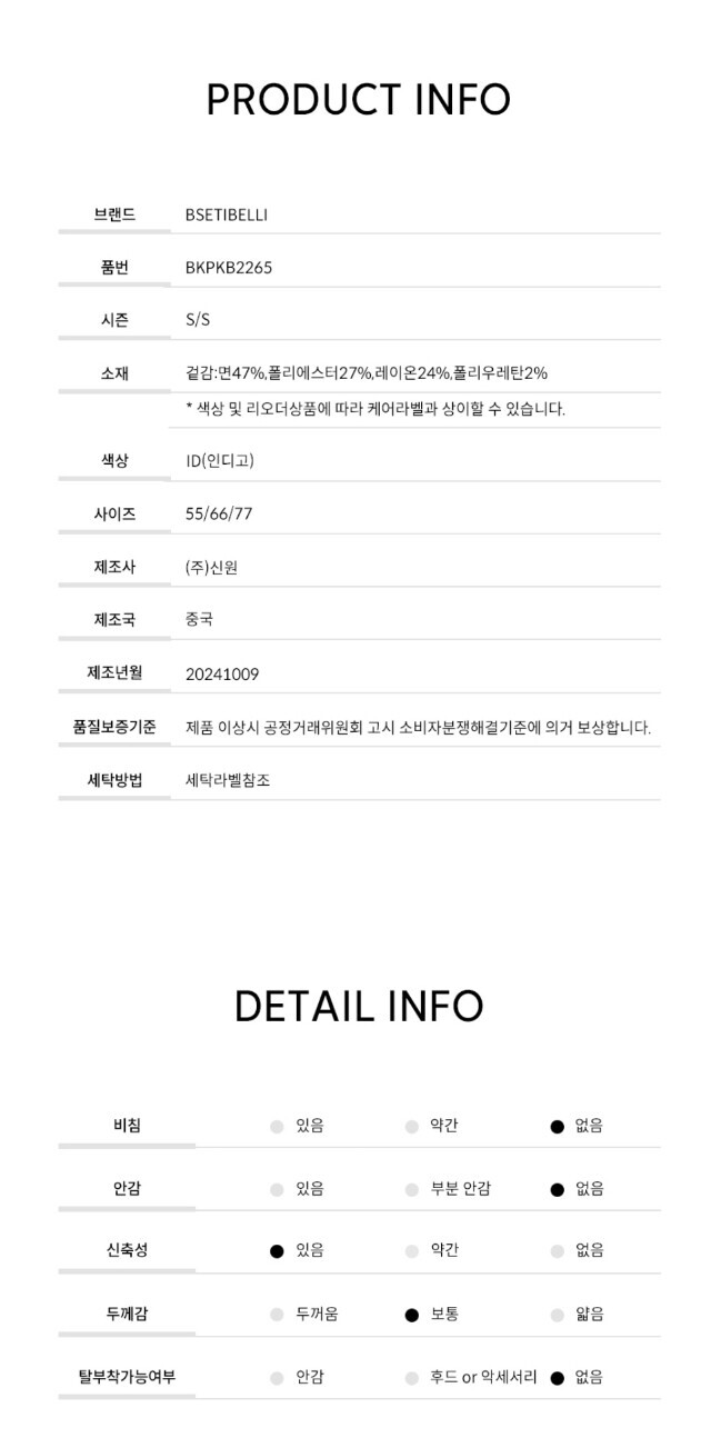 | 1. 제품 소재 (섬유의 조성 또는 혼용률을 백분율로 표시, 기능성인 경우 성적서 또는 허가서) | 상품상세참조 |