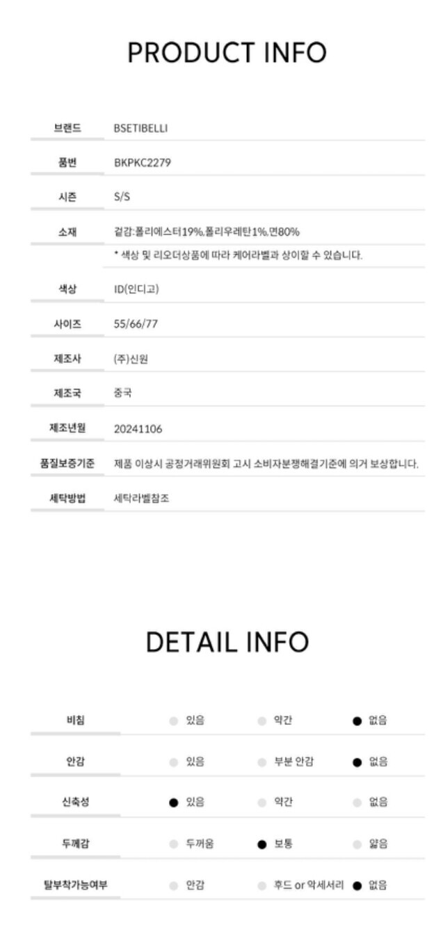| 1. 제품 소재 (섬유의 조성 또는 혼용률을 백분율로 표시, 기능성인 경우 성적서 또는 허가서) | 상품상세참조 |