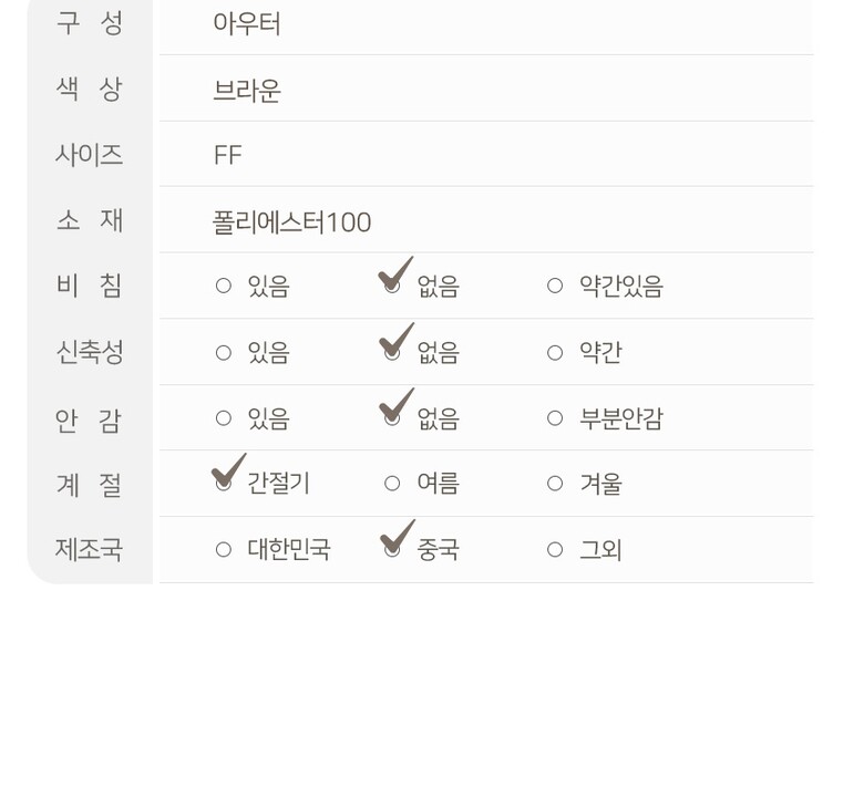 1. 제품 소재 (섬유의 조성 또는 혼용률을 백분율로 표시, 기능성인 경우 성적서 또는 허가서) 상세페이지 참조