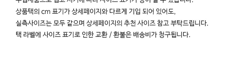 • 처음 배송된 상품상태와 다를 경우(세탁/착용 후 외출하신 경우) 반품이 불가합니다.