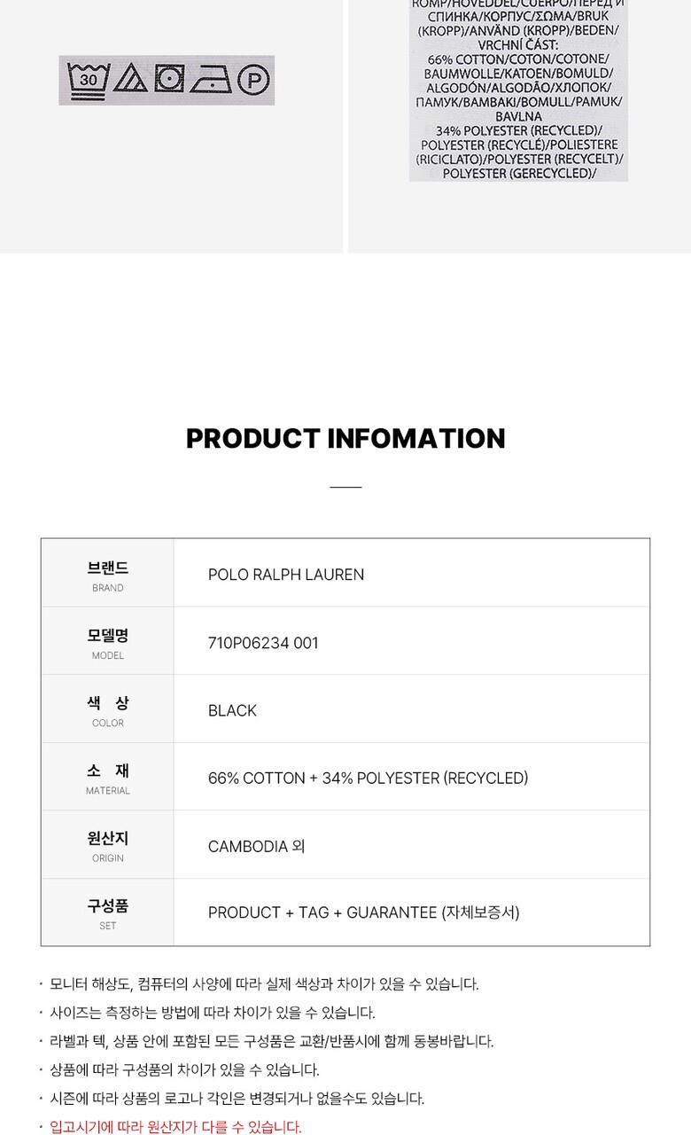 1. 제품 소재 (섬유의 조성 또는 혼용률을 백분율로 표시, 기능성인 경우 성적서 또는 허가서) | 코튼 66% + 폴리에스터 34% (리사이클드) |