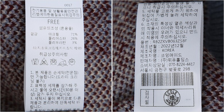 1. 제품 소재 (섬유의 조성 또는 혼용률을 백분율로 표시, 기능성인 경우 성적서 또는 허가서) | 겉감-폴리에스터26% 폴리우레탄3% 아크릴71% |