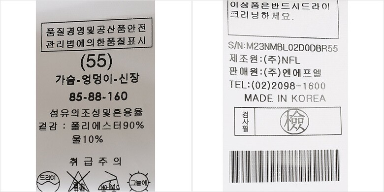 1. 제품 소재 (섬유의 조성 또는 혼용률을 백분율로 표시, 기능성인 경우 성적서 또는 허가서) 겉감-폴리에스터90% 울10%