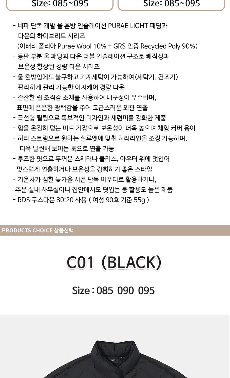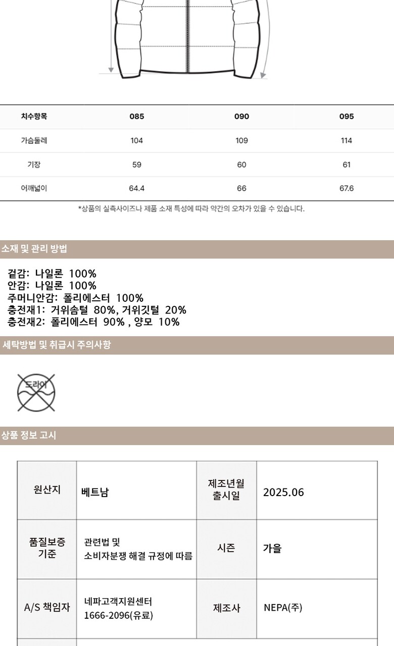 제품소재 : 겉감 나일론 100% / 안감 나일론 100% / 주머니안감 폴리에스터 100% / 충전재1 거위솜털 80% / 충전재1 거위깃털 20% / 충전재2 폴리에스터 90% / 충전재2 양모 10%