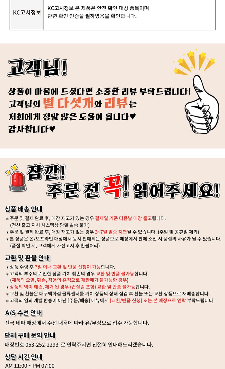 A/S 책임자와 전화번호 : AS 및 기타 문의 사항은 해당 매장 [이승재,053-252-2293] 으로 전화주시면 감사하겠습니다.