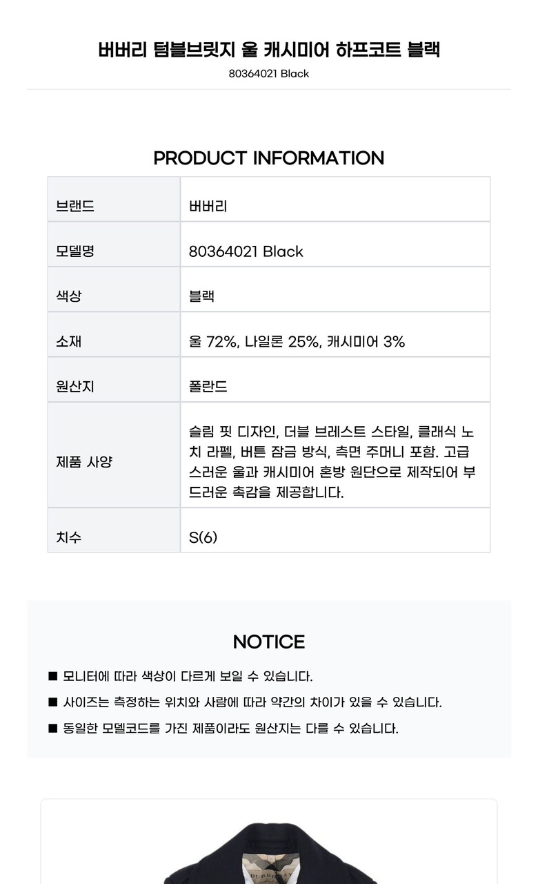 버버리 텀블브릿지 울 캐시미어 하프코트 블랙 80364021
