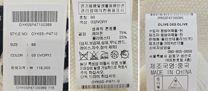 · 취급 시 주의사항 : 원단특성상 마찰시 이염,보풀,미어짐이 발생 가능하므로 착용시 주의 하십시오.