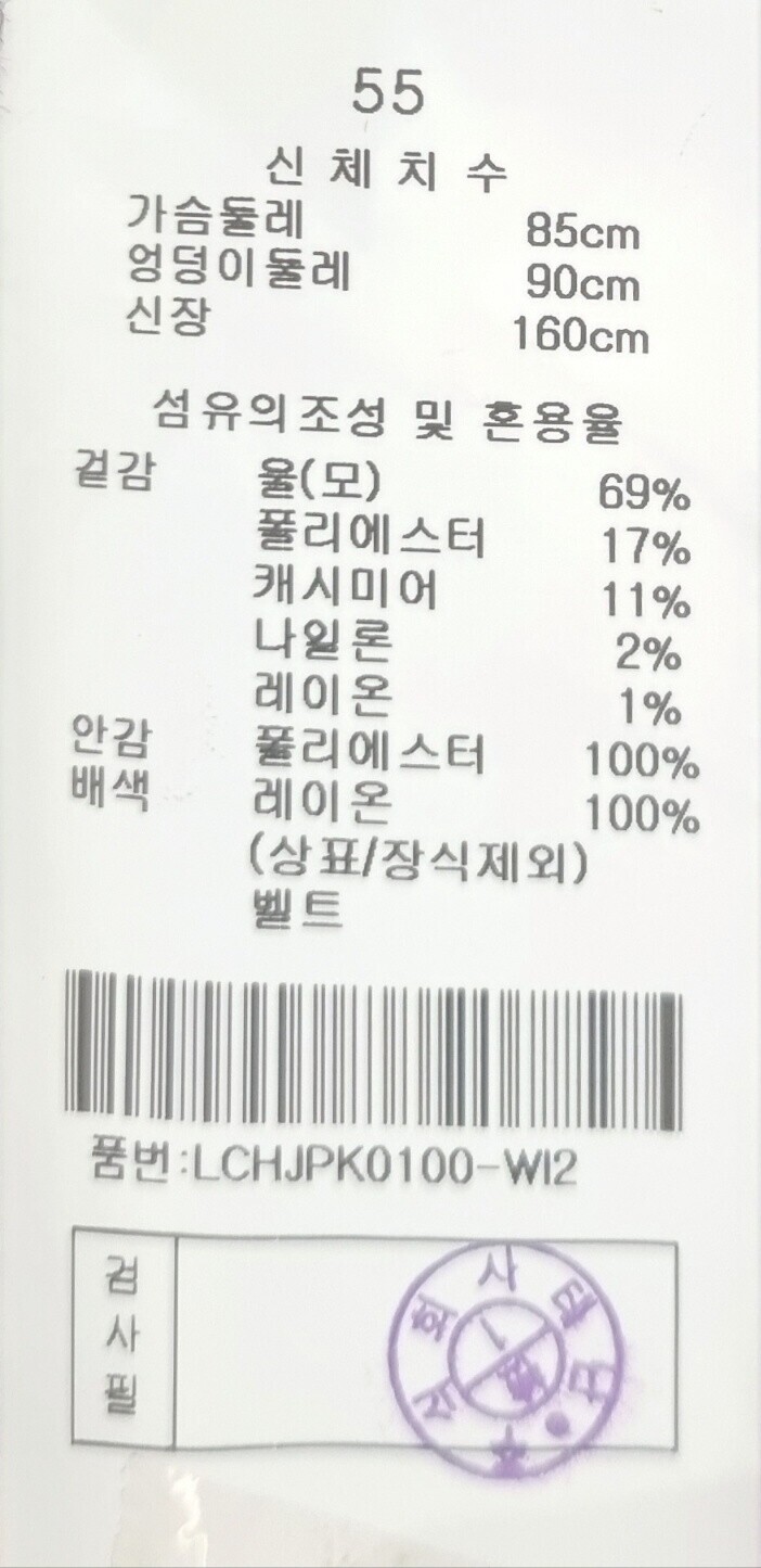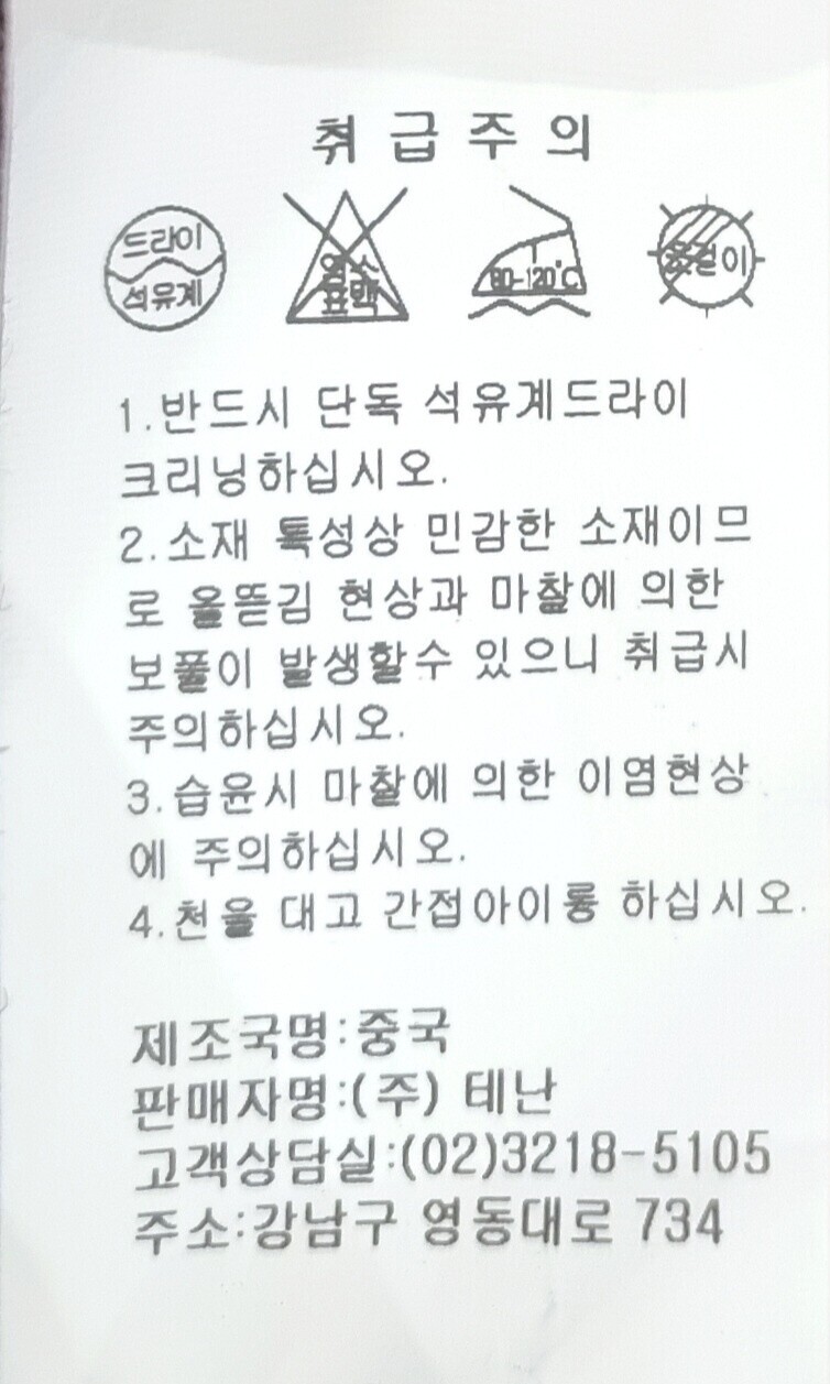 | 6. 세탁방법 및 취급시 주의사항 | 1.반드시 단독 석유계 드라이크리닝하십시오. 2.소재 특성상 민감한 소재이므로 올뜯김 현상과 마찰에 의한 보풀이 발생할수 있으니 취급시 주의하십시오. 3.습윤시 마찰에 의한 이염현상에 주의하십시오. 4.천을 대고 간접아이롱 하십시오. |