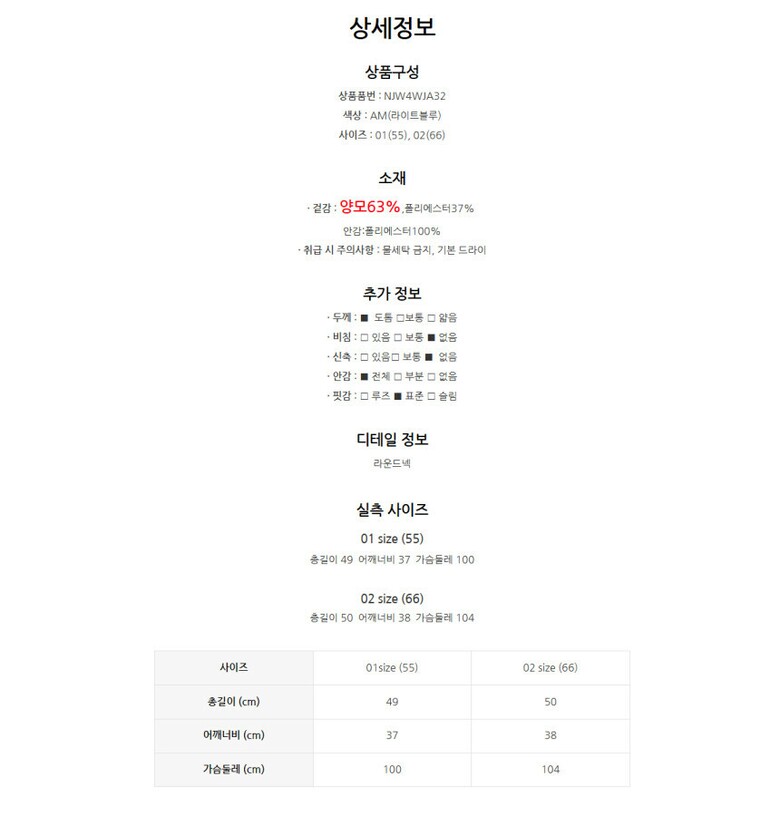 | 1. 제품 소재 (섬유의 조성 또는 혼용률을 백분율로 표시, 기능성인 경우 성적서 또는 허가서) | 겉감:양모63%,폴리에스터37% 안감:폴리에스터100% |