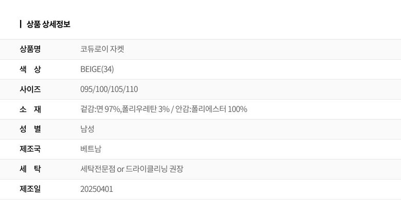 | 1. 제품 소재 (섬유의 조성 또는 혼용률을 백분율로 표시, 기능성인 경우 성적서 또는 허가서) | 면97%, 폴리우레탄3% |