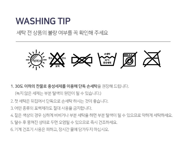 | 6. 세탁방법 및 취급시 주의사항 | 첫 단독 손세탁 권장, 단독세탁, 손세탁, 중성세제, 찬물세탁 |