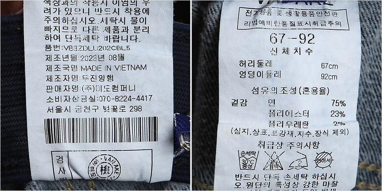 1. 제품 소재 (섬유의 조성 또는 혼용률을 백분율로 표시, 기능성인 경우 성적서 또는 허가서) 겉감-면75% 폴리에스터23% 폴리우레탄2%