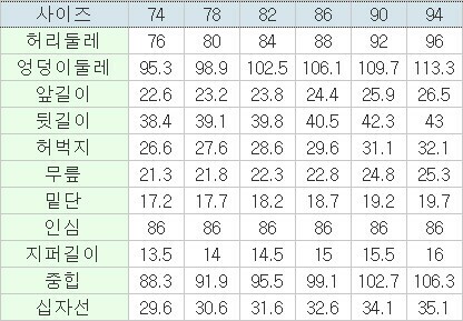 | 3. 치수 | 74(28~29),78(30~31),82(32~33),86(34~35),90(36),94(37) |