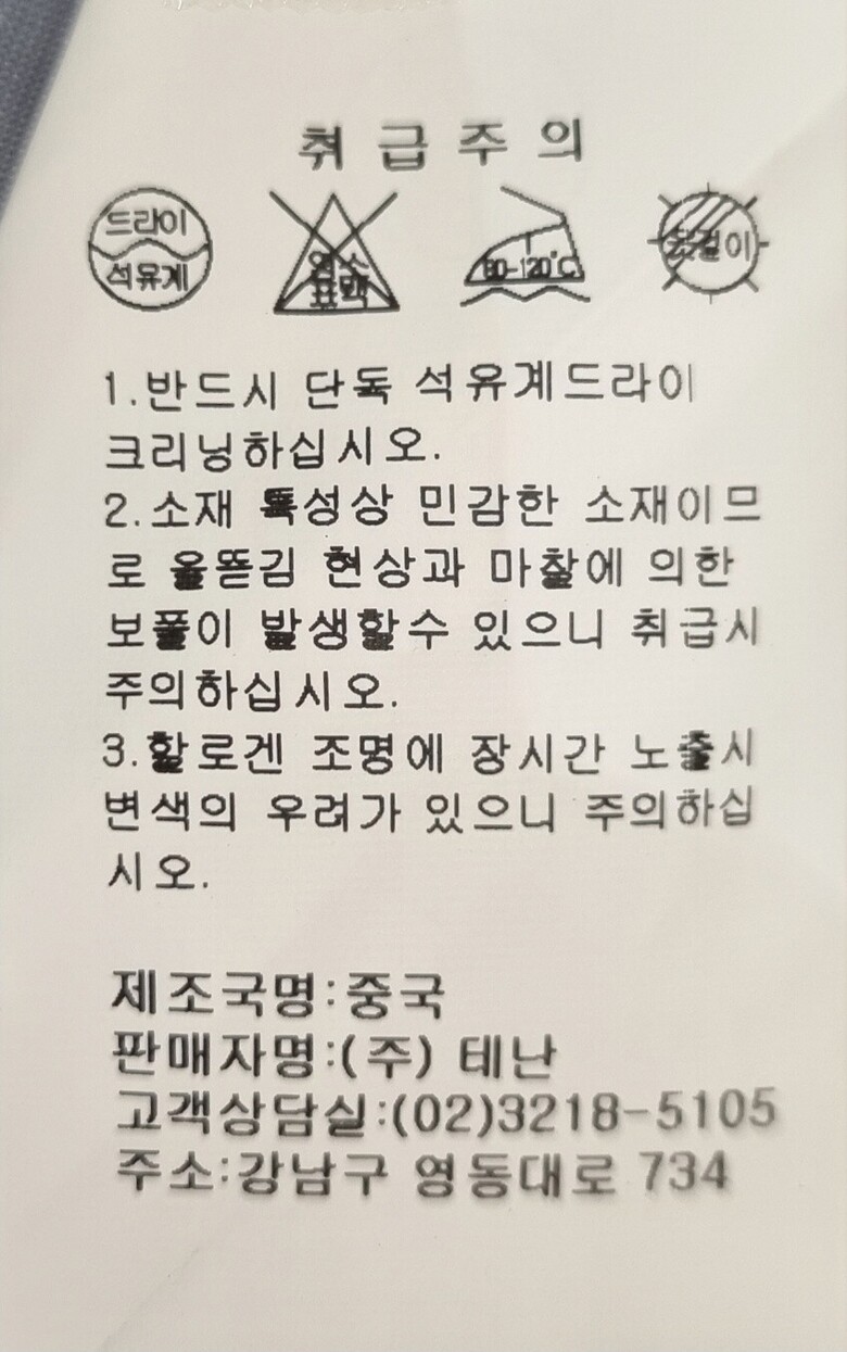 6. 세탁방법 및 취급시 주의사항 1.반드시 단독 석유계 드라이크리닝하십시오. 2.소재 특성상 민감한 소재이므로 올뜯김현상과 마찰에 의한 보풀이 발생할 수 있으니 취급시 주의하십시오. 3.습윤시 마찰에 의한 이염현상에 주의하십시오.