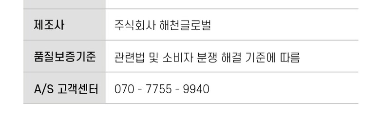 | 9. A/S 책임자와 전화번호 | (주)해천글로벌 / 070-7755-9940 |