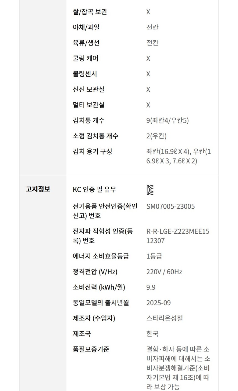 1. 모델명(품번) 김치냉장고 K225LW121