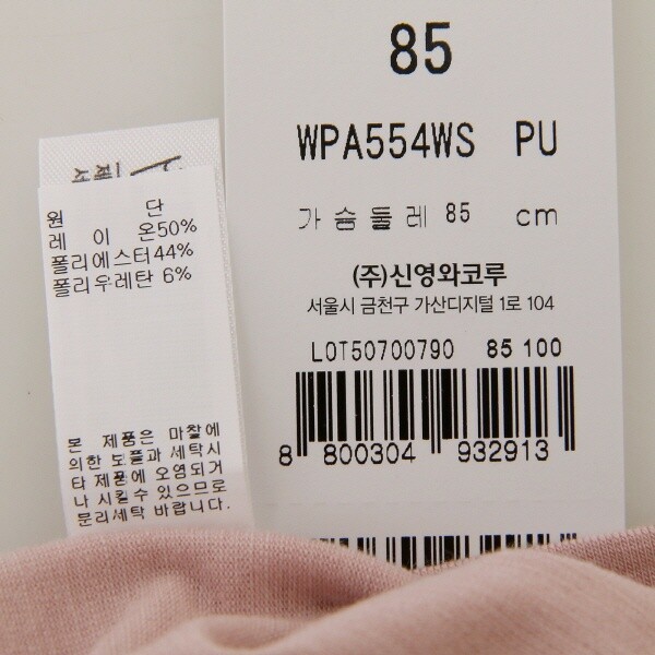 | 6. 세탁방법 및 취급시 주의사항 | 1.속옷은 중성세제를 이용하여 단독 손세탁하시기를 권합니다2.세탁전 제품에 부착된 라벨의 세탁표시를 확인 바랍니다3.세탁시 세제를 세탁물에 직접뿌리는 것은 금물입니다4.건조기 사용을 금합니다 |