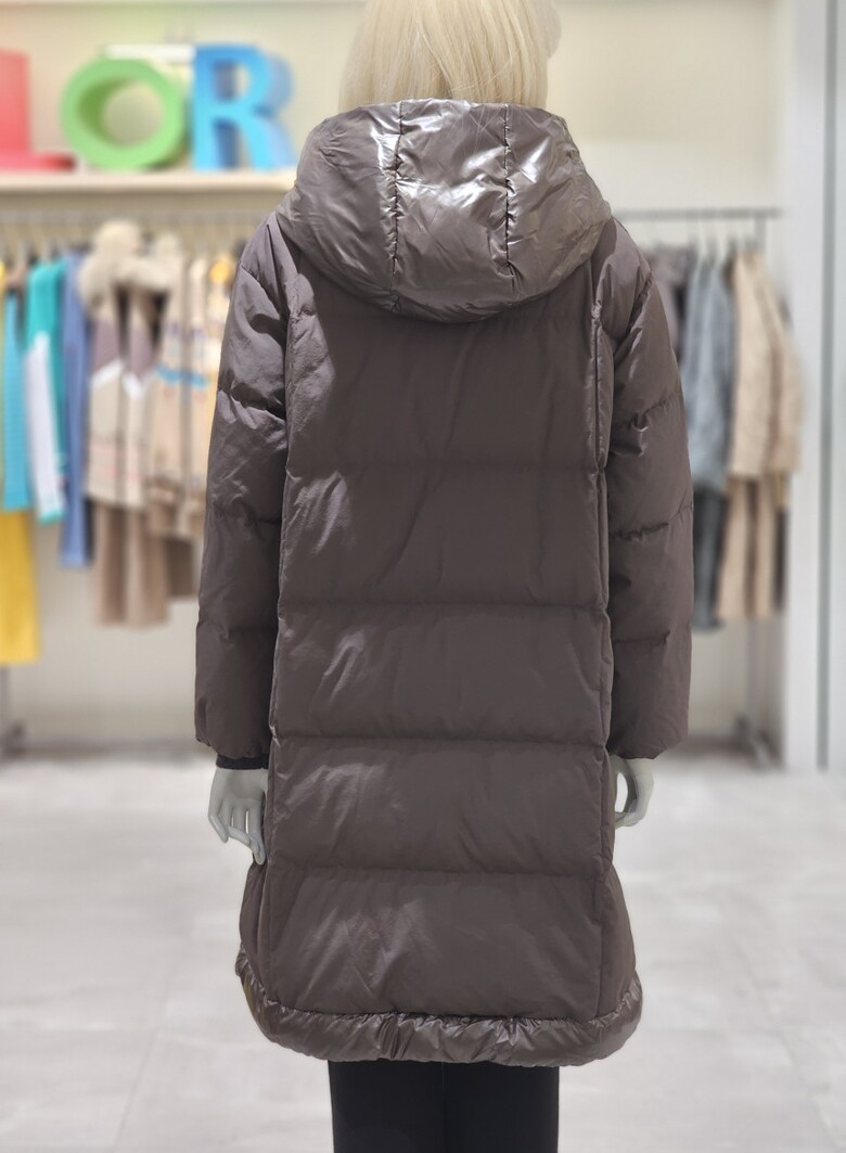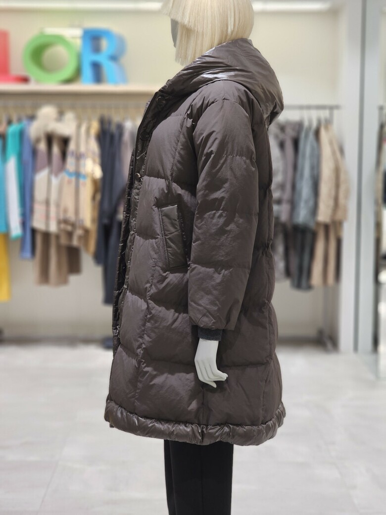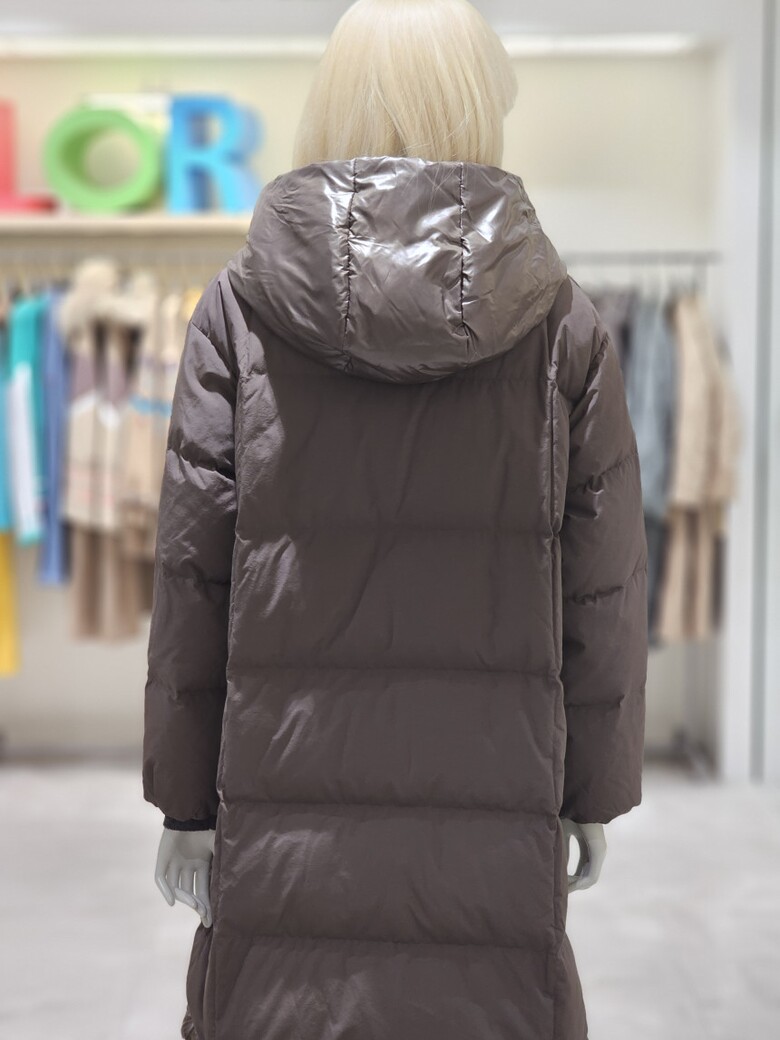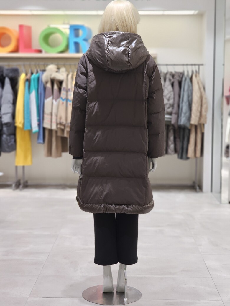 샤이닝한 끝단 배색으로 포인트를 준 후드 덕다운 패딩.