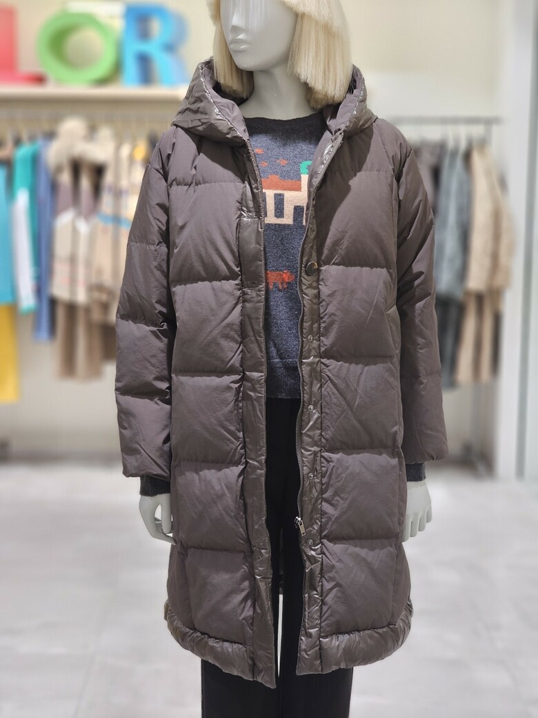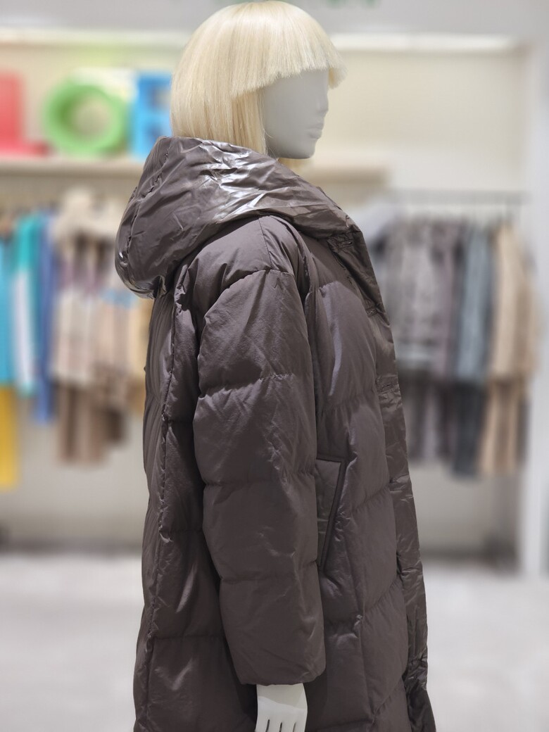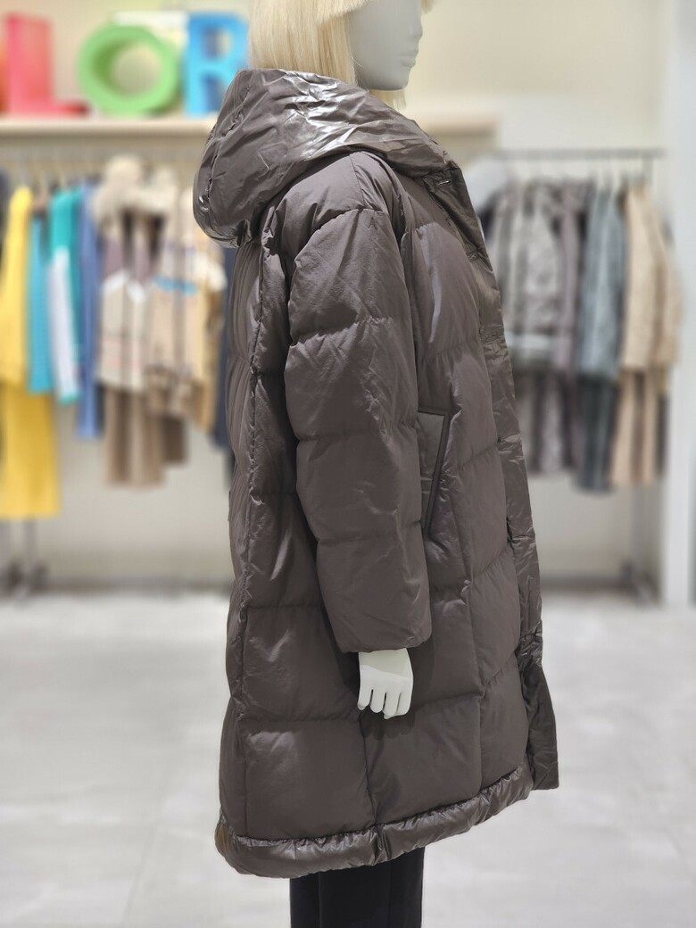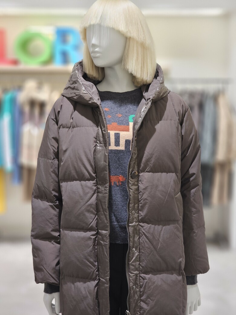 샤이닝한 끝단 배색으로 포인트를 준 후드 덕다운 패딩.