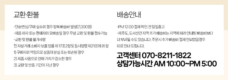 • 모든 규정은 전자상거래법에 의거하며, 택배사정으로 배송이 지연된 경우 재화를 공급받은 날로부터 7일 이내에 반품 가능합니다.