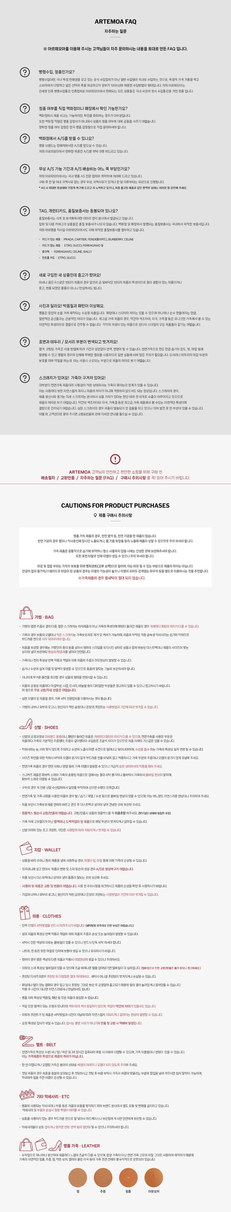 | 6. 세탁방법 및 취급시 주의사항 | 가죽 제품은 수분 (비, 물, 땀)과 기름, 습기 및 직사광선 노출 시 변형, 변색이 발생 할 수 있으니 유의하여 주세요. 가죽 관리시, 가죽 전용 왁스 제품을 이용하시고 일반 세척제나 벤젠은 절대로 사용하지 마세요. 밝은 컬러의 양가죽, 누벅소재, 스웨이드 제품은 얼룩과 상처가 있는 곳에 왁스를 바르시는 경우 왁스를 바로 흡수하여 컬러가 진해지며 얼룩이 더해지므로, 왁스 사용을 주의하시고 사전에 확인을 먼저 해주셔야합니다. 물 혹은 비에 젖었을 경우 마른 천으로 가볍게 두드려서 물기를 제거하고 직사광선이나 불을 피해 통풍이 잘 되는 그늘에서 건조해 주시기 바랍니다. 이염이 잘 되는 의류 (청바지 등) 와 함께 사용시, 마찰로 인해 이염이 발생 할 수 있으니 주의 부탁드립니다. 페이턴트 가죽에 다른 짙은 색상의 제품이 마찰할 경우 착색이 될 수도 있으니 이점 유의해주세요. 가죽은 사용에 의해 소재가 갈라지거나 마모될 수 도있으며 이는 소재의 특성일 뿐 제품의 내구성과는 관계가없습니다. |