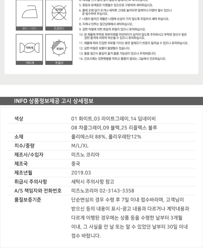 | 9. A/S 책임자와 전화번호 | 미즈노코리아/02-3143-3358 |