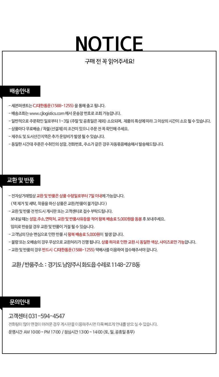 상품불량에 의한 반품, A/S, 품질보증 및 피해보상 등에 관한 사항은 소비자 분쟁해결기준(공정거래위원회 고시) 구매자가 미성년자인 경우에는 상품 구입시 법정대리인이 동의하지 아니하면 미성년자 본인 또는 법정대리인이 구매취소 할 수 있습니다. |
