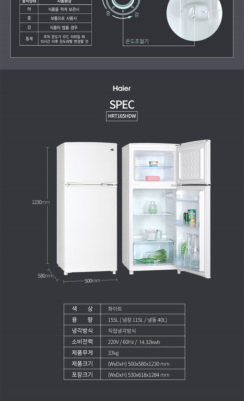 6. 크기/무게(폭x높이x깊이)(cm) | 500 x 1230 x 580 mm,155L,일반냉장고 |
