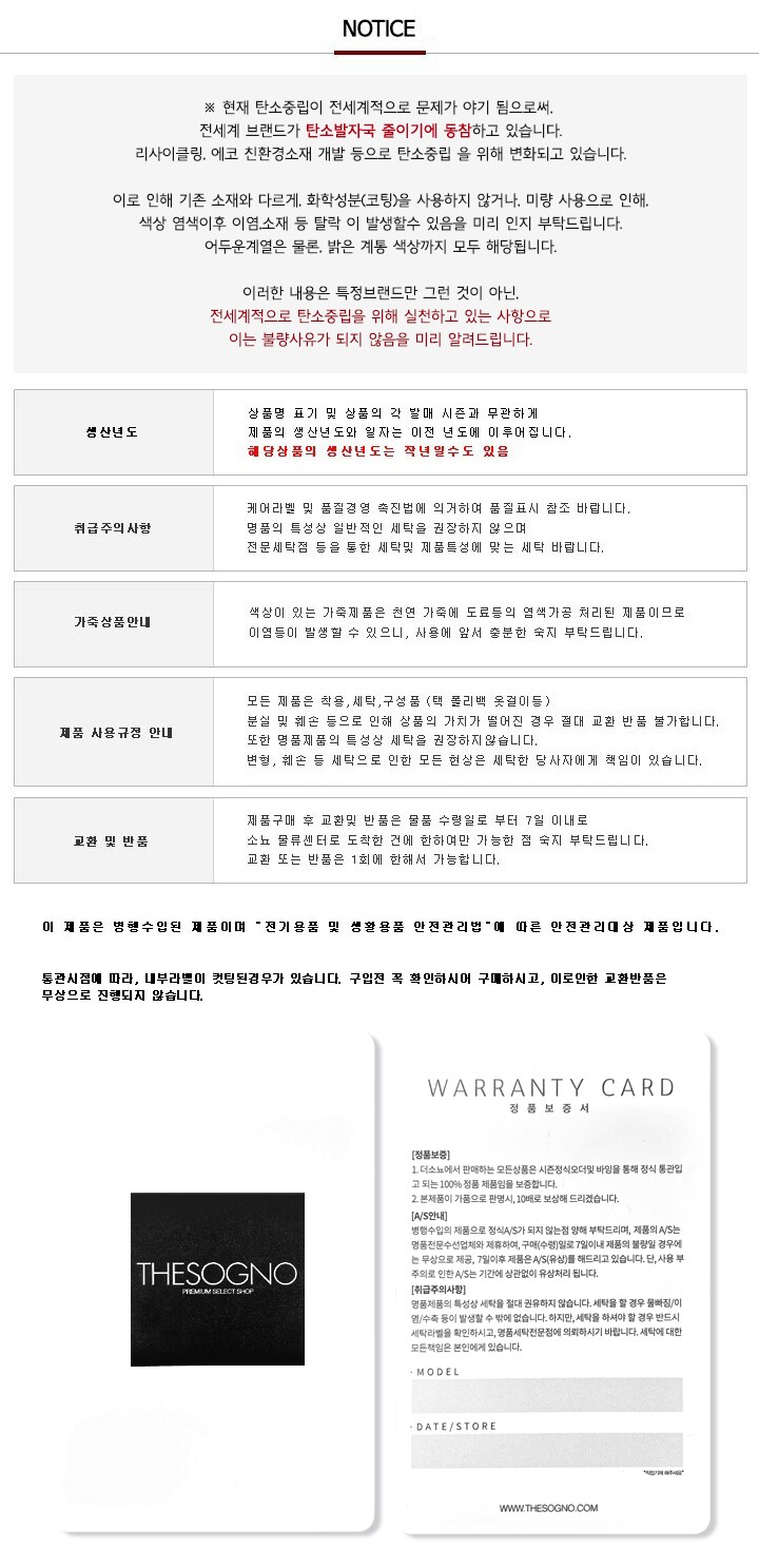 | 6. 세탁방법 및 취급시 주의사항 | 가죽 제품은 수분 (비, 물, 땀)과 기름, 습기 및 직사광선 노출 시 변형, 변색이 발생 할 수 있으니 유의하여 주세요. 가죽 관리시, 가죽 전용 왁스 제품을 이용하시고 일반 세척제나 벤젠은 절대로 사용하지 마세요. 밝은 컬러의 양가죽, 누벅소재, 스웨이드 제품은 얼룩과 상처가 있는 곳에 왁스를 바르시는 경우 왁스를 바로 흡수하여 컬러가 진해지며 얼룩이 더해지므로, 왁스 사용을 주의하시고 사전에 확인을 먼저 해주셔야합니다. 물 혹은 비에 젖었을 경우 마른 천으로 가볍게 두드려서 물기를 제거하고 직사광선이나 불을 피해 통풍이 잘 되는 그늘에서 건조해 주시기 바랍니다. 이염이 잘 되는 의류 (청바지 등) 와 함께 사용시, 마찰로 인해 이염이 발생 할 수 있으니 주의 부탁드립니다. 페이턴트 가죽에 다른 짙은 색상의 제품이 마찰할 경우 착색이 될 수도 있으니 이점 유의해주세요. 가죽은 사용에 의해 소재가 갈라지거나 마모될 수 도있으며 이는 소재의 특성일 뿐 제품의 내구성과는 관계가없습니다. |