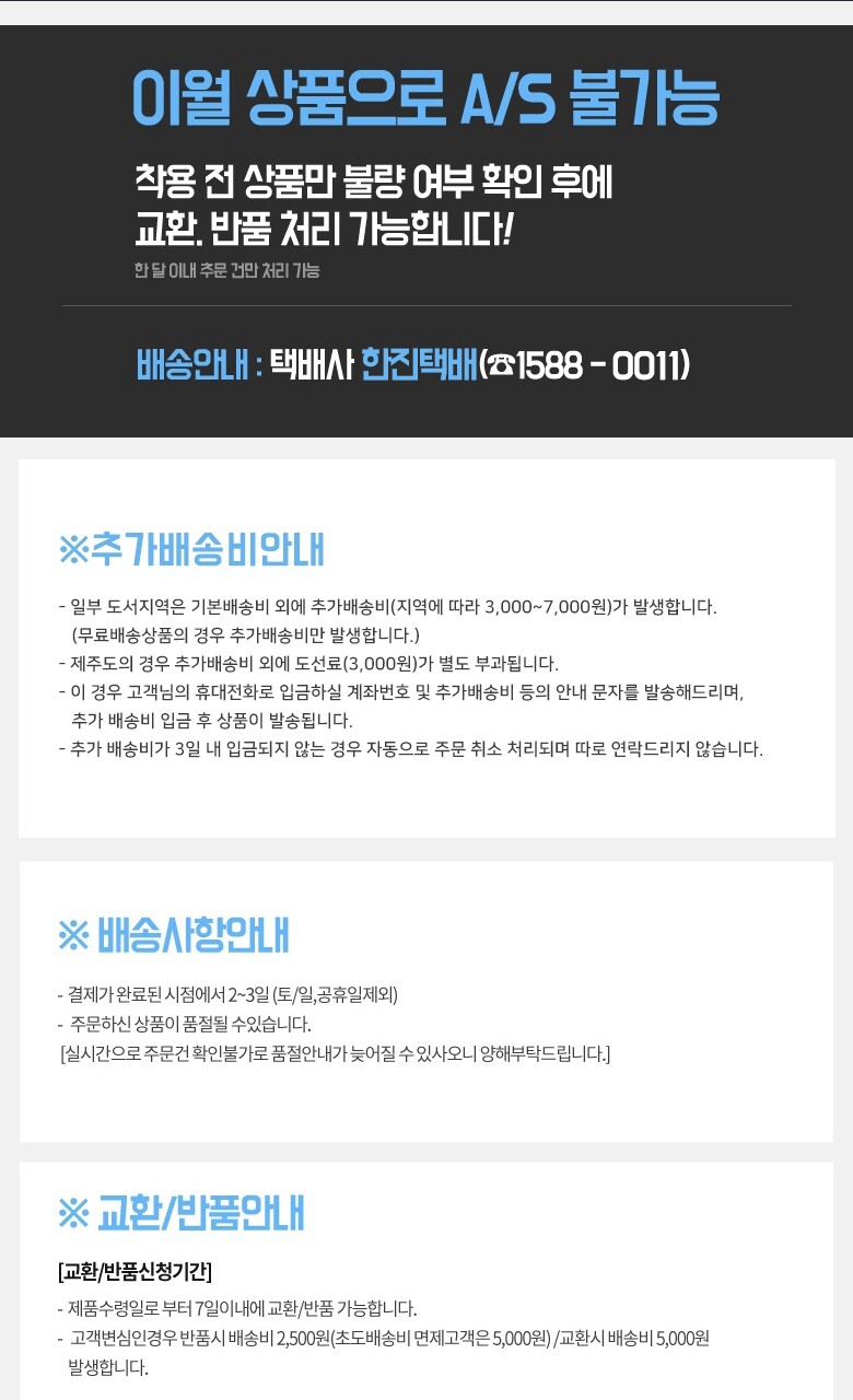 상품불량에 의한 반품, A/S, 품질보증 및 피해보상 등에 관한 사항은 소비자 분쟁해결기준(공정거래위원회 고시) 구매자가 미성년자인 경우에는 상품 구입시 법정대리인이 동의하지 아니하면 미성년자 본인 또는 법정대리인이 구매취소 할 수 있습니다. |