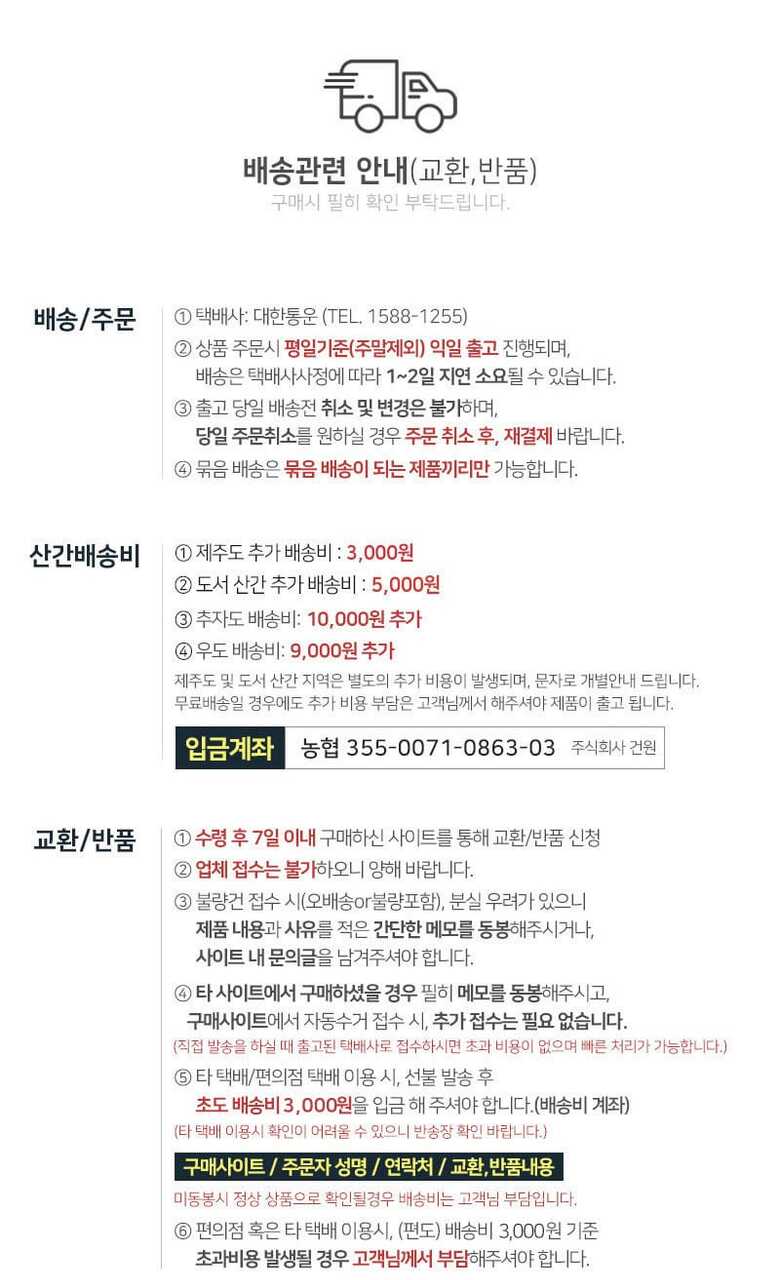 상품불량에 의한 반품, A/S, 품질보증 및 피해보상 등에 관한 사항은 소비자 분쟁해결기준(공정거래위원회 고시) 구매자가 미성년자인 경우에는 상품 구입시 법정대리인이 동의하지 아니하면 미성년자 본인 또는 법정대리인이 구매취소 할 수 있습니다. |
