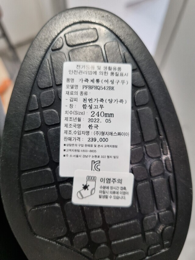 | 1. 제품 소재 (운동화인 경우에는 겉감, 안감을 구분하여 표시) | 양가죽 |