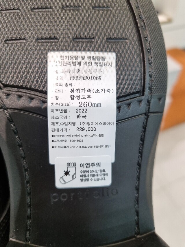 | 1. 제품 소재 (운동화인 경우에는 겉감, 안감을 구분하여 표시) | 소가죽 |