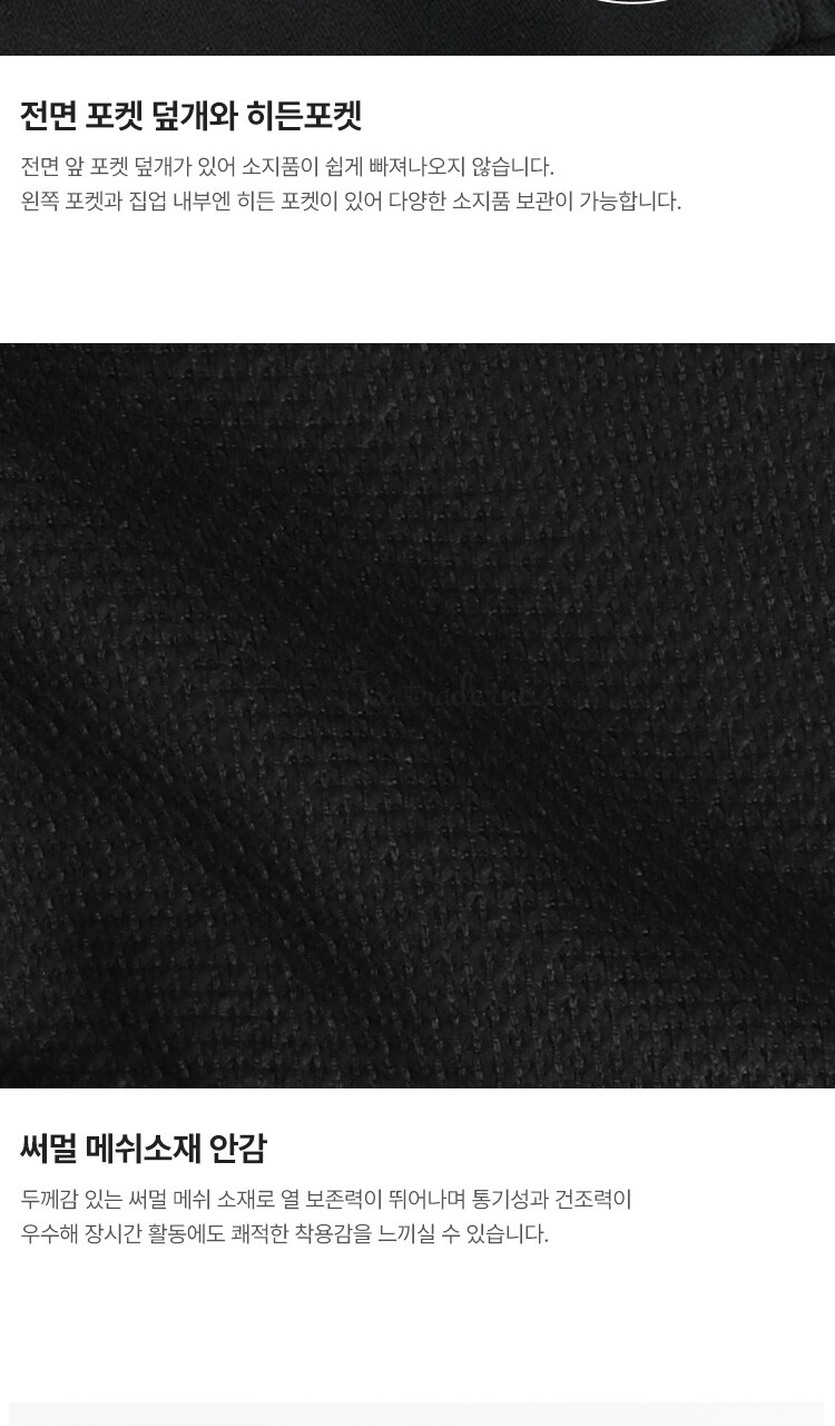 1. 제품 소재 (섬유의 조성 또는 혼용률을 백분율로 표시, 기능성인 경우 성적서 또는 허가서) | 겉감-코튼 50% 폴리에스터 50% / 안감-폴리에스터 100% |