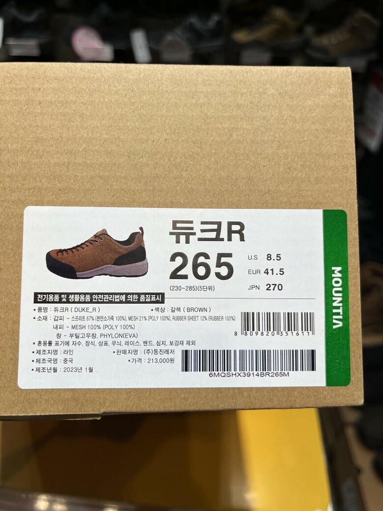 | 1. 제품 소재 (운동화인 경우에는 겉감, 안감을 구분하여 표시) | 갑피 - 스프리트 67%(천연소가죽 100%), MESH 21%(폴리에스터 100%), |