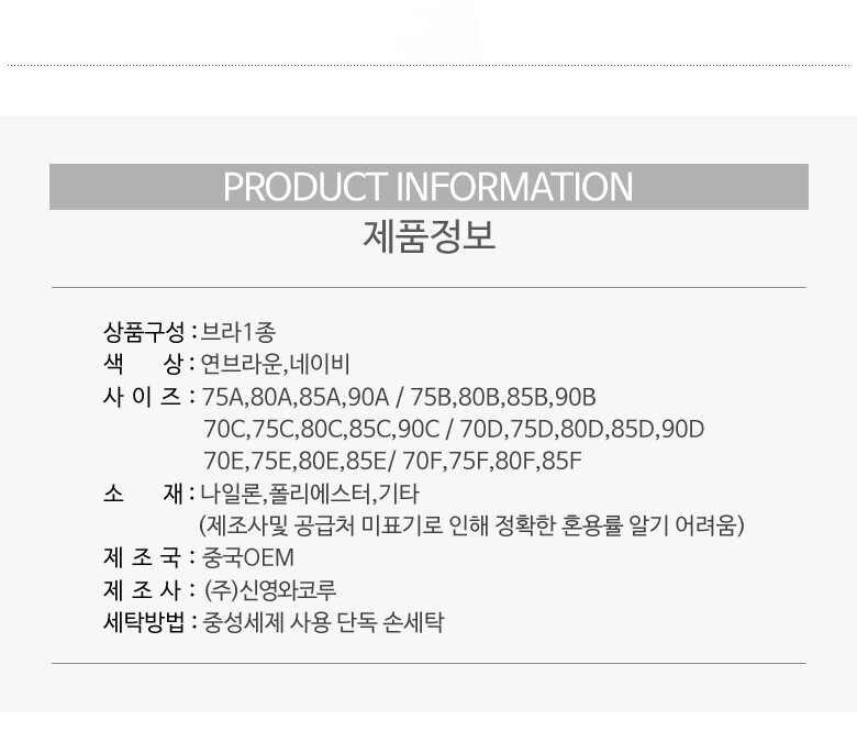 | 1. 제품 소재 (섬유의 조성 또는 혼용률을 백분율로 표시, 기능성인 경우 성적서 또는 허가서) | 브라-나일론,폴리에스터,기타(제조사미제공 혼용률 알수없음) |