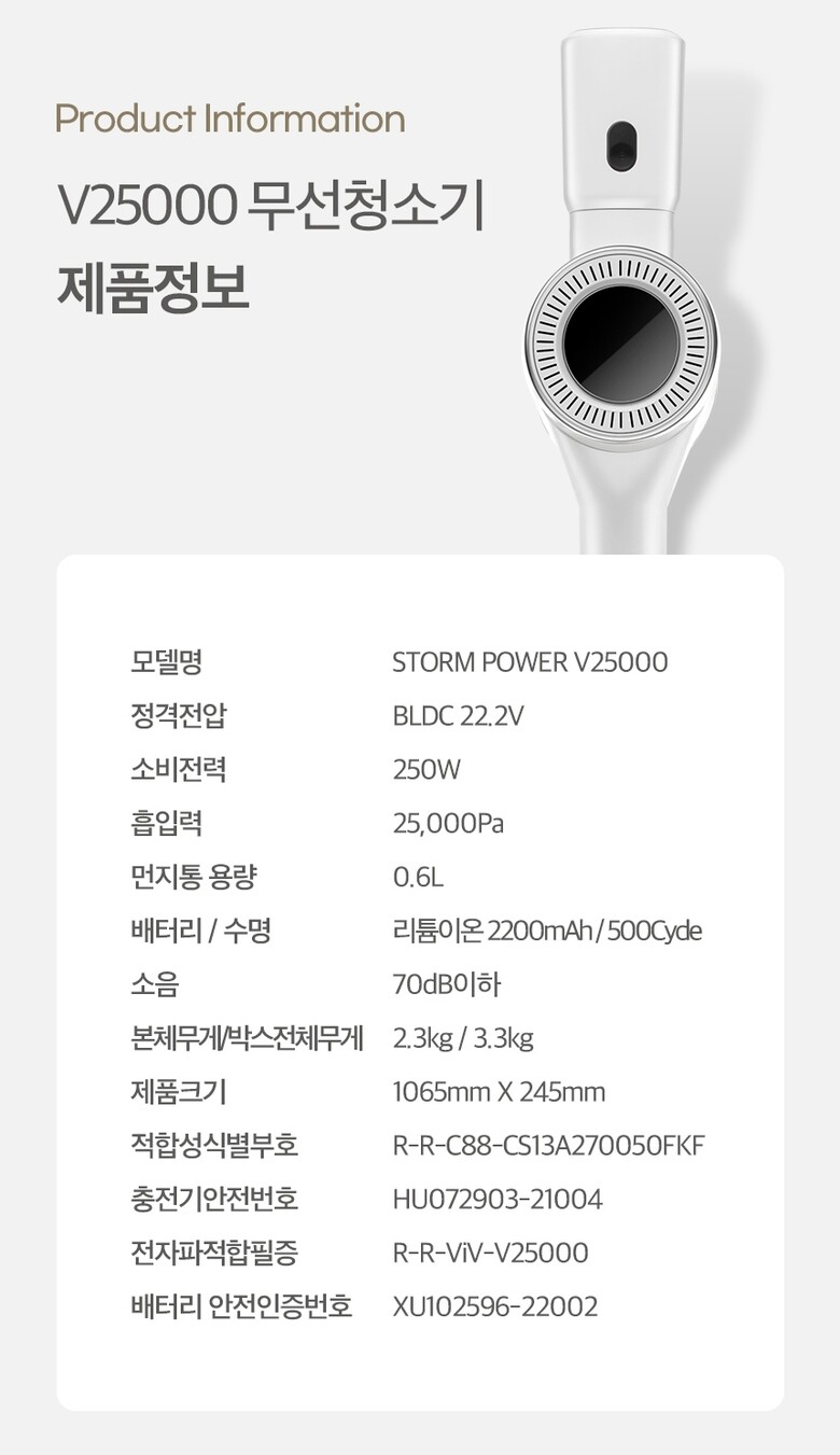 | 1. 모델명(품번) | 비브르 스톰파워 무선청소기 V25000 |