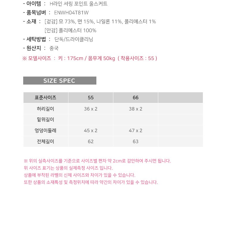 1. 제품 소재 (섬유의 조성 또는 혼용률을 백분율로 표시, 기능성인 경우 성적서 또는 허가서) | [겉감] 모 73%, 면 15%, 나일론 11%, 폴리에스터 1% [안감] 폴리에스터 100% |