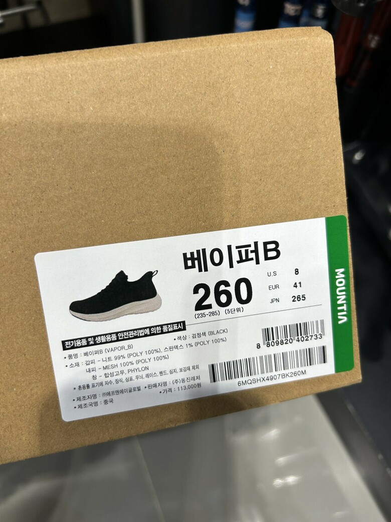 | 1. 제품 소재 (운동화인 경우에는 겉감, 안감을 구분하여 표시) | 갑피 - 니트 99% (POLY 100%), 스판덱스 1%(POLY 100%) 내피 - MESH |