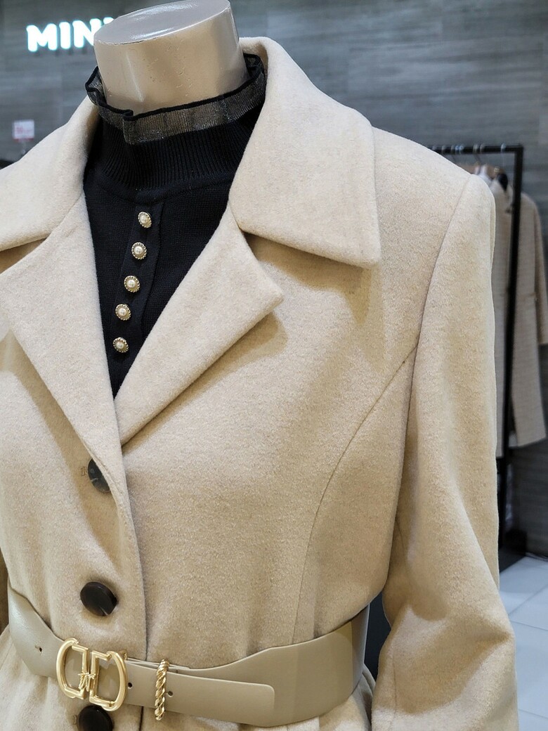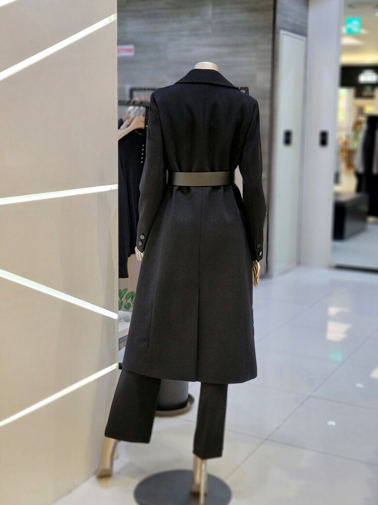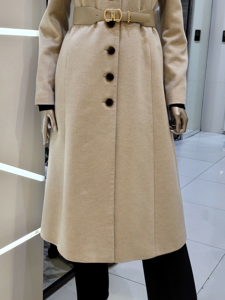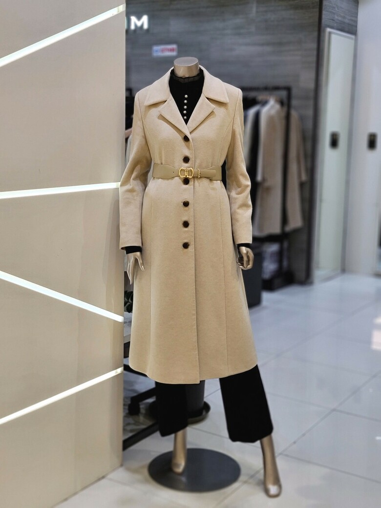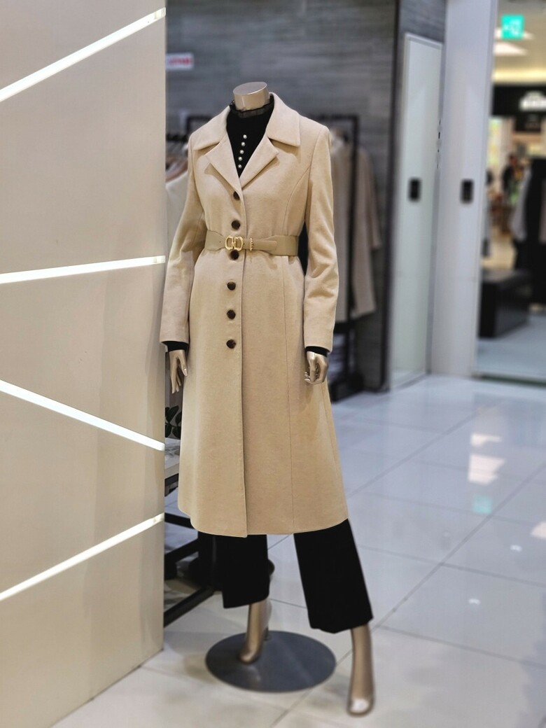 페미닌한 무드의 슬림 A 라인 롱 코트입니다.