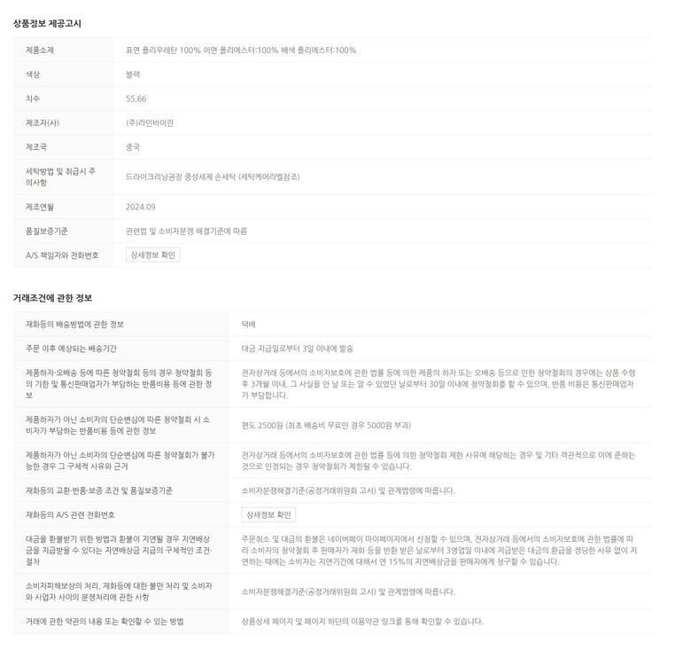 | 6. 세탁방법 및 취급시 주의사항 | 상품상세참조 |