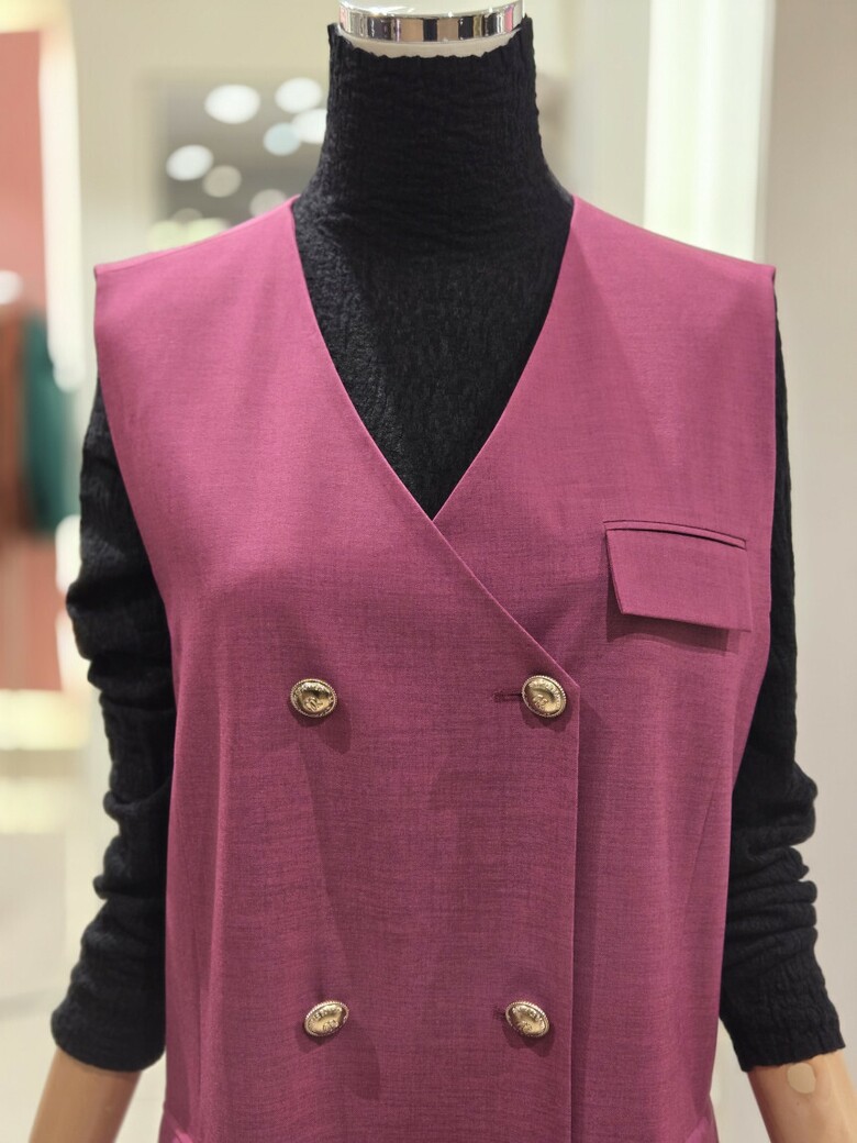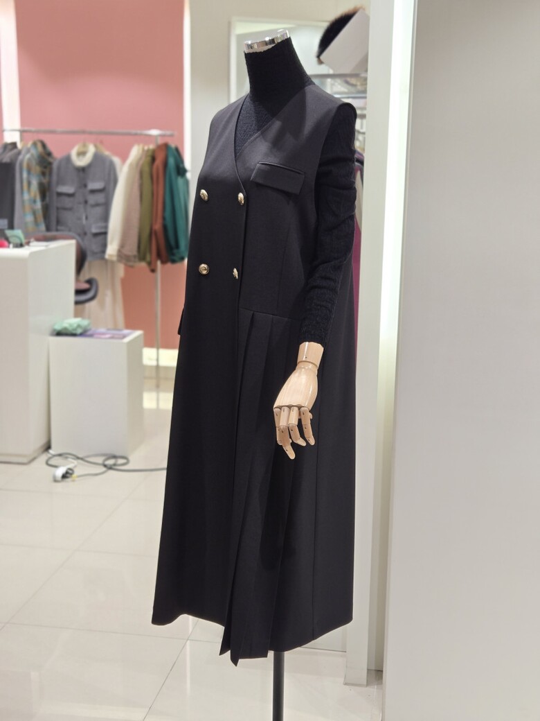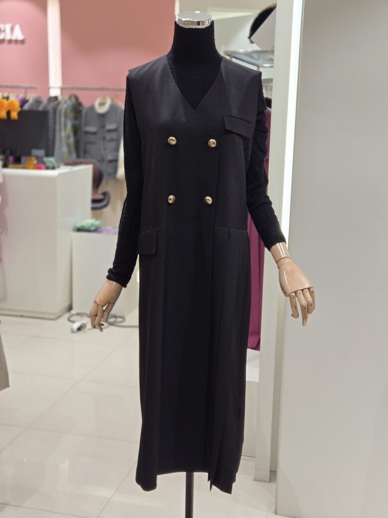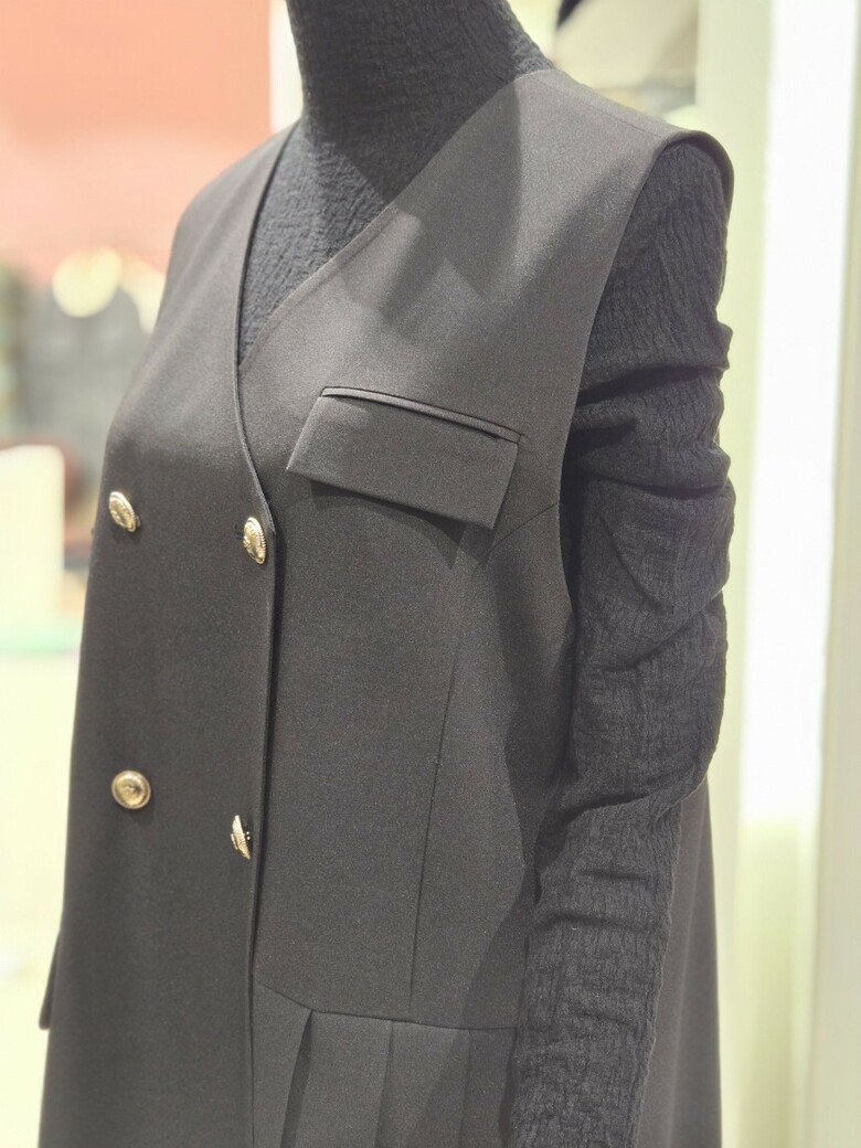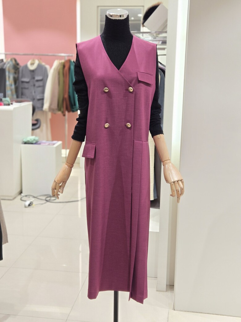 조끼형식으로 앞면 더블버튼 한쪽 스커트 언발런스 플리츠가 여성스럽게 되어있는