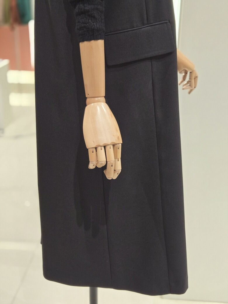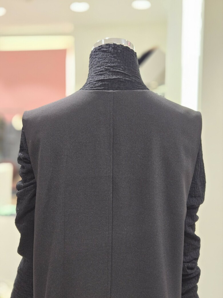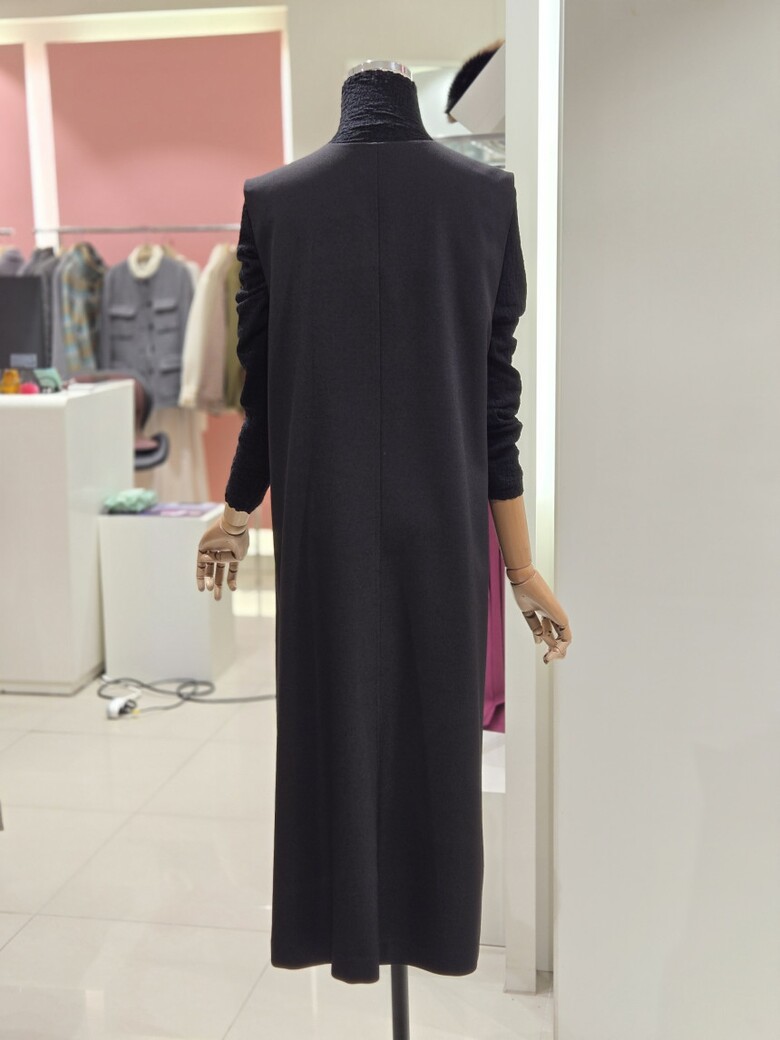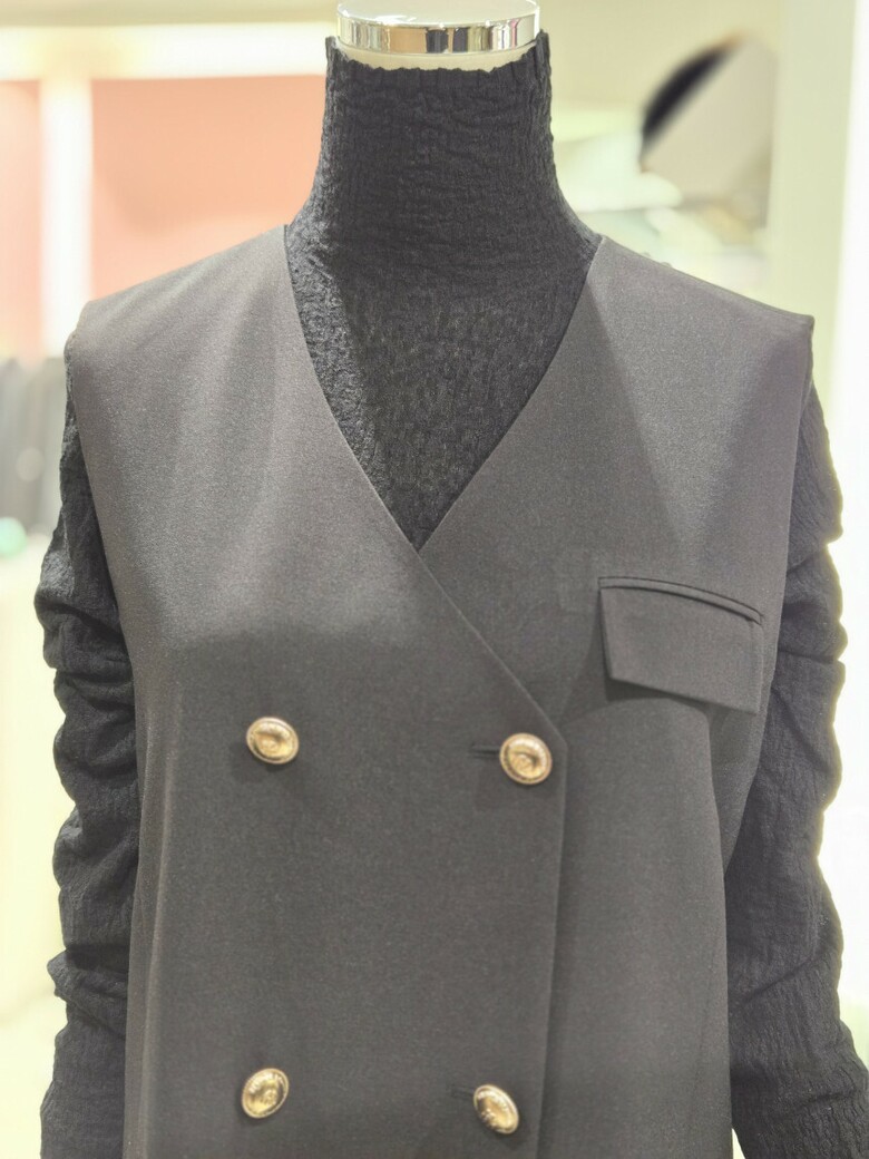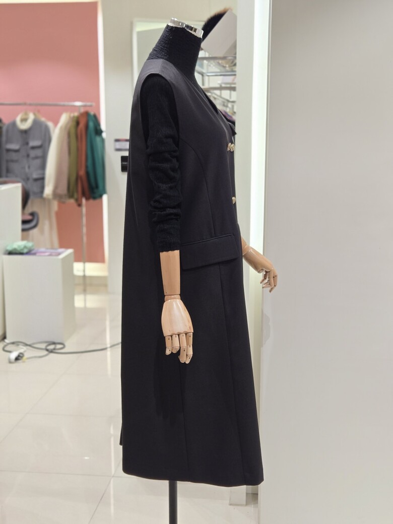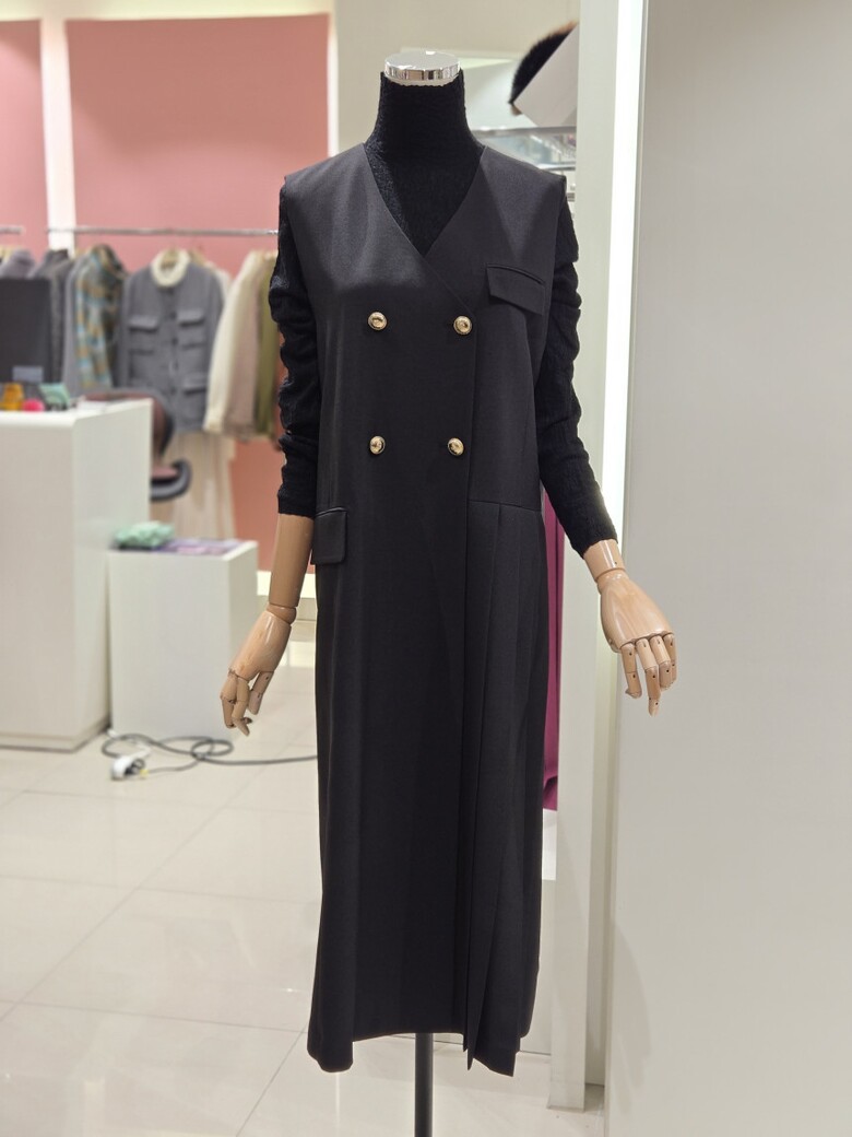 조끼형식으로 앞면 더블버튼 한쪽 스커트 언발런스 플리츠가 여성스럽게 되어있는